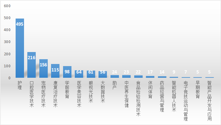 2025年我校共有毕业生1387人,护理495人,口腔医学技术216人,宠物医疗技术156人,康复治疗技术115人,学前教育98人,医学美容技术64人,眼视光技术61人,大数据技术56人,助产24人,中医养生保健23人,食品检验检测技术22人,休闲体育17人,药品经营与管理14人,智能机器人技术9人,电子竞技运动与管理7人,早期教育5人,智能产品开发与应用5人。