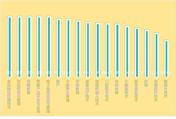 2025届各专业毕业生毕业去向落实率:食品检验检测技术100%;药品经营与管理100%;早期教育100%;智能产品开发与应用100%;电子竞技运动与管理100%;助产95.83%;中医养生保健95.65%;学前教育93%;康复治疗技术90.43%;智能机器人技术89%;口腔医学技术88.42%;休闲体育88%;大数据技术84%;医学美容技术81.25%;护理77.37%;宠物医疗技术72.43%;眼视光技术60.65%。